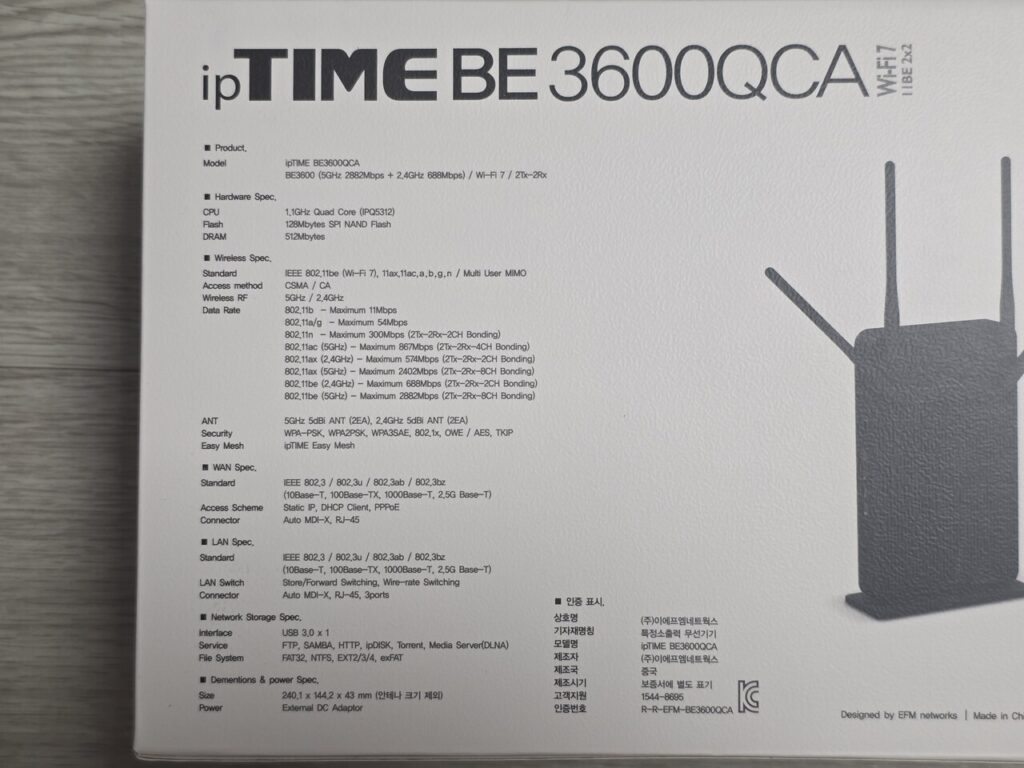 • 기존의 공유기가 iptime사의 A8004T로 약 6년간 만족하며 사용하였고, 제조는 중국이지만 국산 브랜드로 중국제조 중국 브랜드나 중국제조 대만 브랜드에 비해 조금더 pcb 백도어 리스크가 적을 것이라고 판단하였다. 따라서 iptime사의 be3600qca 제품을 골라 주문하게 되었다.