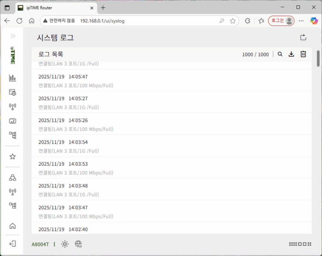 • 최근 잘되던 인터넷이 하루에 두세번 끊기는 현상이 발생하였다. 건물내 인터넷 점검 문제인 듯하여 대수롭지 않게 넘어갔지만 여러날 지속되는 것을 보고 공유기 내역을 보니 모뎀과 네트워크 연결은 정상인데 LAN포트 유선연결이 되었다 안되었다 하는 것을 보았다.
